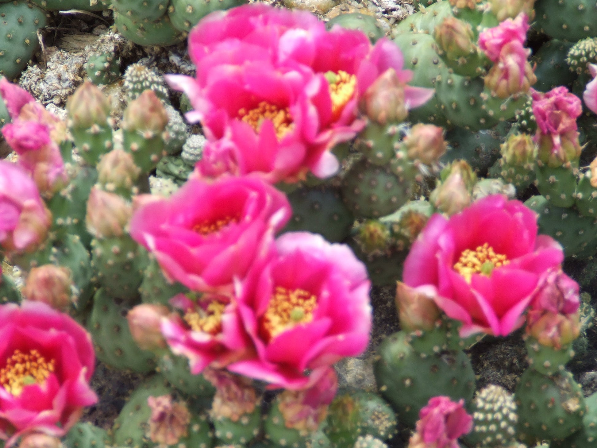 Deep pink flowers in June on a beautiful, dwarf cushion, very choice. Plump, round pads. No spines, tiny glochids. 4" high by 18" wide. Zone 3. Excellent in outdoor containers. (Claude Barr selection, Canada?) Dry fruit. Sold as rooted, 2.5" potted plant.